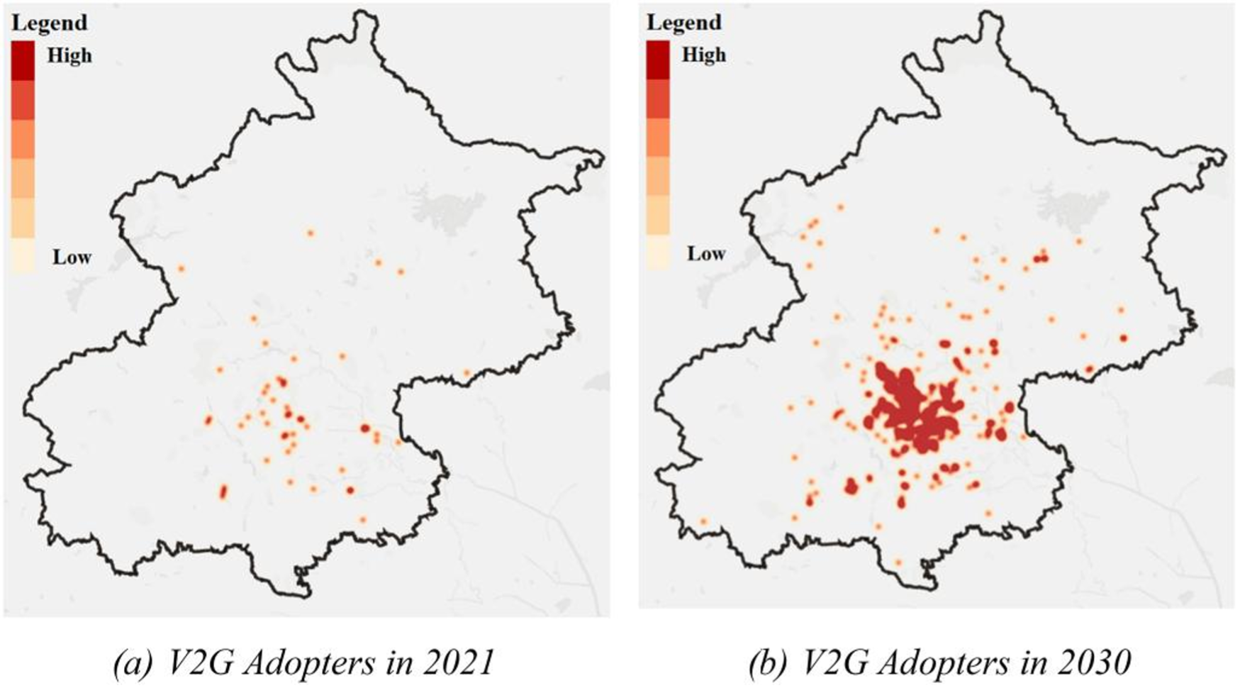 Simulation results: Spatial distribution of V2G adopters in Beijing (only BEV adoption is simulated)