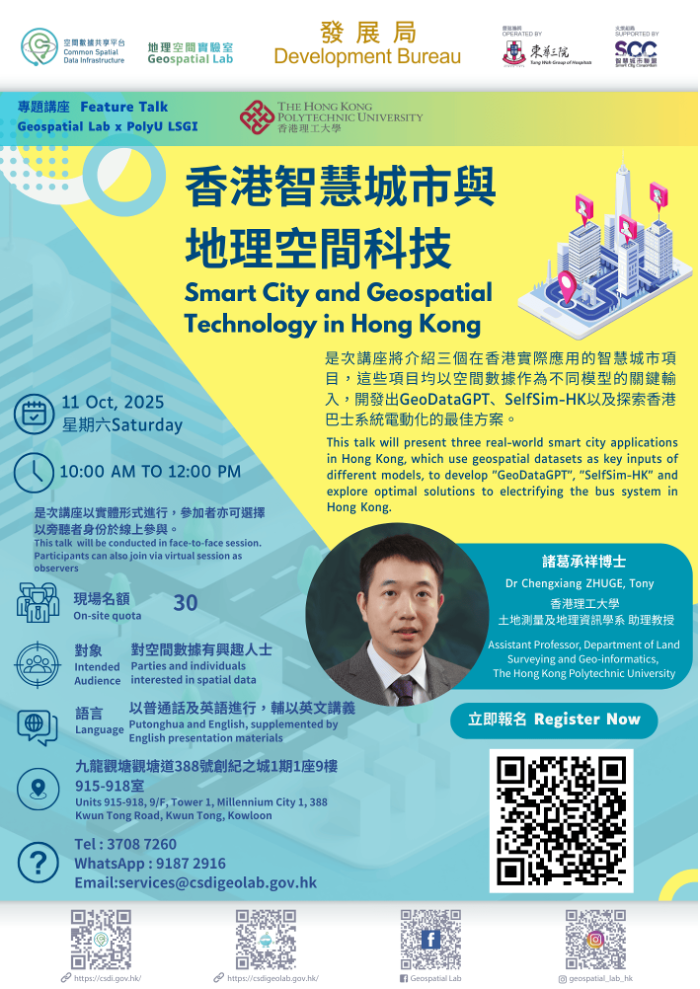 Dr. Chengxiang Zhuge was invited to speak at the “Smart City and Geospatial Technology in Hong Kong” feature talk, co-organized by the Development Bureau’s Geospatial Lab and PolyU LSGI.
